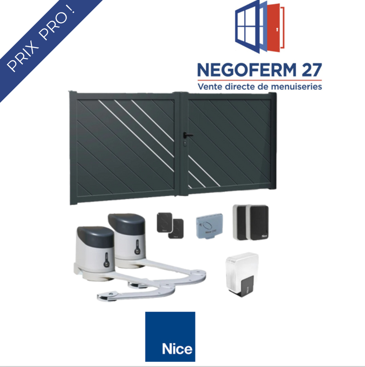 Le HYKEKIT de NICE est un kit de motorisation à bras articulés conçu pour portails à deux battants. Il permet une ouverture automatique fluide et sécurisée, tout en offrant une installation flexible adaptée aux portails résidentiels de grande taille.